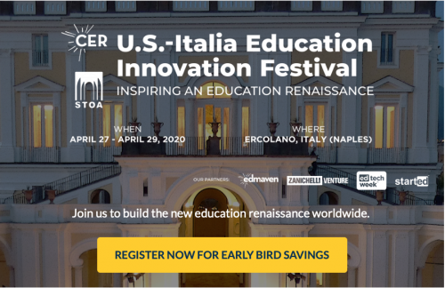 ITALY & EdTECH? ANDIAMO! CER is proud to present with Stoà, the most important and historic management school in the South of Italy, The U.S.–Italia Education Innovation Festival, April 27–29, 2020, in Ercolano, Italy, steps from Pompeii and overlooking the Bay of Naples. This will be the first global Ed Tech event in Italy, with a concentration on innovations and technologies that amplify, engage and educate the world’s students in the arts and sciences. Our focus will be on exploring, uncovering and connecting with technologies and innovative practices already being increasingly applied across the globe to learning, teaching, and in the workforce, bringing us each day more quickly than the last into the 21st Century. Together, we will move from early education, through K–12 and Higher Ed and across the Workforce, breaking up the silos to build continuum of education models that cut through all levels of education, preparing us for work, life and explosive change–across the globe. Visit our website to learn more and register to attend and gather with the experts, investors, entrepreneurs and start-ups from one of the world’s most beautiful, culturally rich, scientifically pioneering countries in the world.