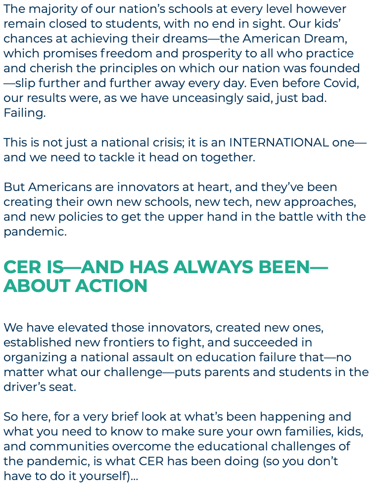 Founded in 1993, the Center for Education Reform aims to expand educational opportunities that lead to improved economic outcomes for all Americans — particularly our youth — ensuring that conditions are ripe for innovation, freedom and flexibility throughout U.S. education. We’re always delighted to hear from our readers…suggestions, questions and even the occasional complaint!